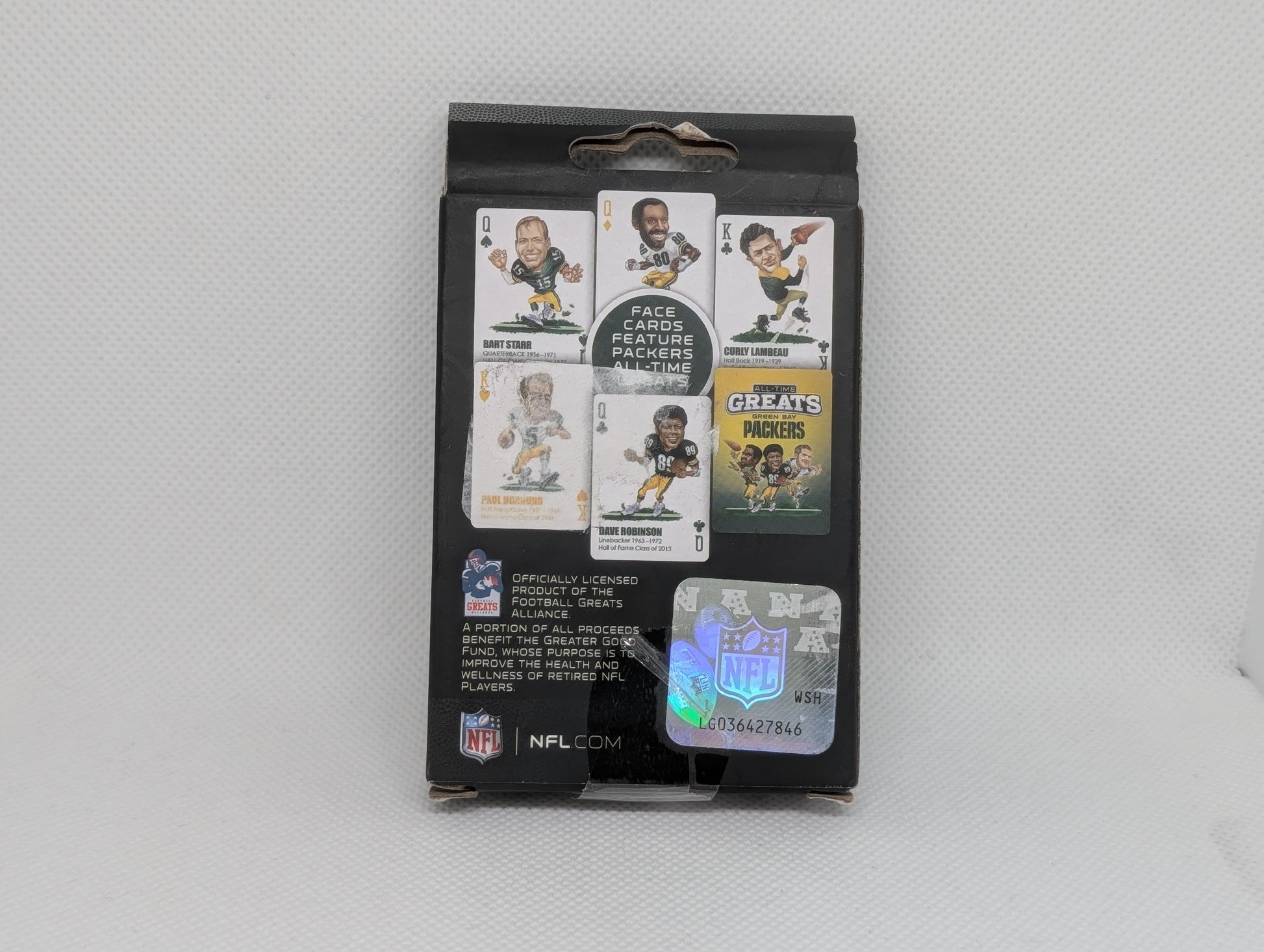 Celebrate legendary Packers history with this official NFL playing card deck featuring Green Bay's all-time greatest players. Each card showcases iconic moments and standout athletes who defined the franchise. Perfect for fans, collectors, and card game enthusiasts alike. Durable, high-quality cards bring your favorite team's legacy to every hand you play. Show your Packers pride with every shuffle and deal.